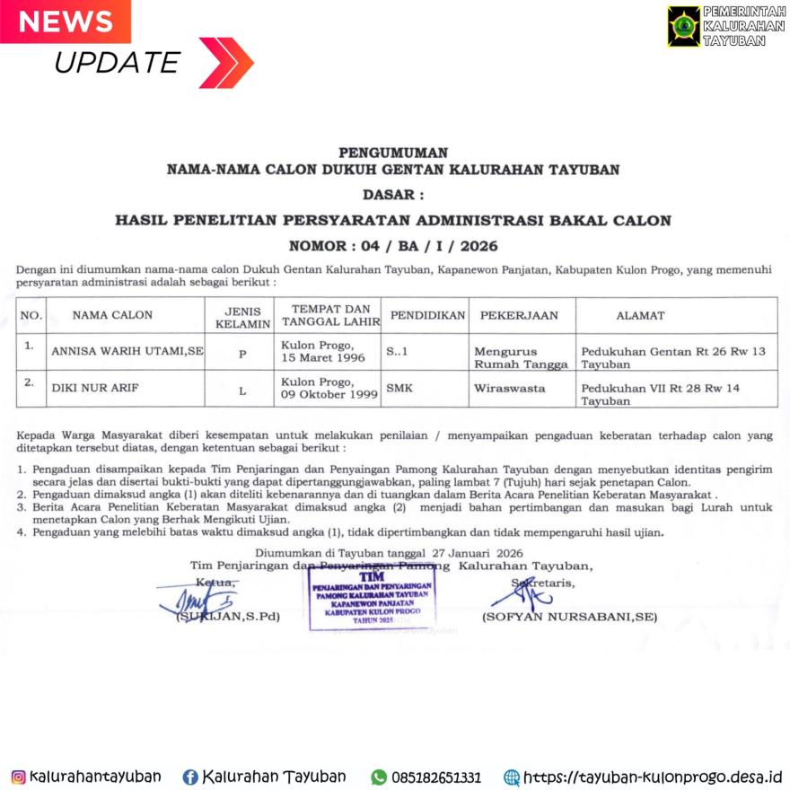 Tim Penjaringan dan Penyaringan Pamong Kalurahan Tayuban telah selesai melakukan penelitian terhadap kelengkapan dan keabsahan persyaratan administrasi bakal calon dukuh gentan Kalurahan Tayuban dengan hasil sebagai berikut :